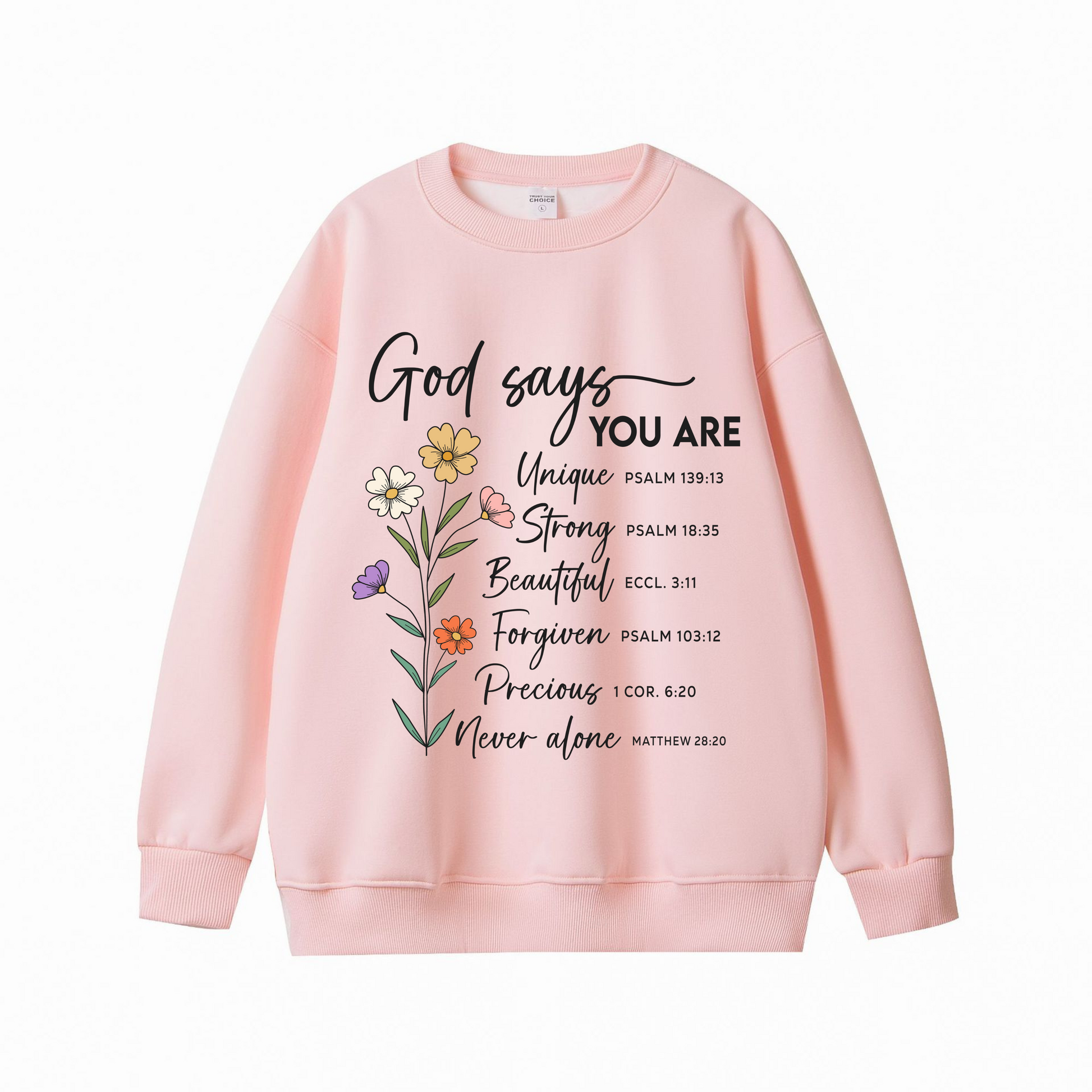 This “God Says You Are” sweatshirt beautifully reminds you of your worth through Scripture — Unique (Psalm 139:13), Strong (Psalm 18:35), Beautiful (Eccl. 3:11), Forgiven (Psalm 103:12), Precious (1 Cor. 6:20), and Never Alone (Matthew 28:20).